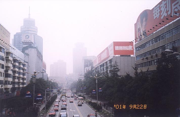 由天橋另一邊瞭望成都一景 , 圖中這條馬路是成都的主要幹道 , 其地位就像是高雄的中山路一樣 ,