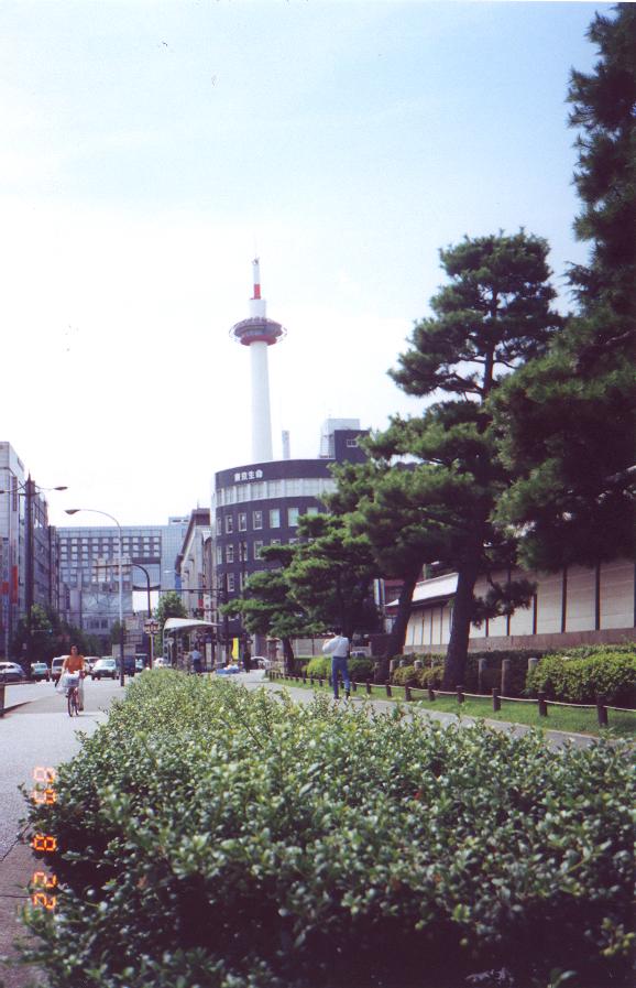 京都市區一景 : 拍攝的地點正是位於京都著名的東本願寺外廣場 , 圖中所見到地標為京都塔 , 位於京都駛北側 , 塔高131公尺 , 建於1964年 , 其基塔底下9層樓為一旅館 , 俱樂部 , 辦公室 , 商場及餐廳 ; 而京都塔的觀景臺則是位於塔高100公尺處 , 是觀賞整個京都的最佳地點 , 同時上部的高塔也是氣象測候站與空氣汙染檢測站 . 圖中藍色狹長形現代建築物為京都駛 , 後站一樓有商店街 ; 前站底下則是地下商店街 , 當然規模遠小於號稱日本最大的大阪地下商店街 . 當然地下商店街的東西比較便宜 , 但是都要加5%的稅金 . . . |