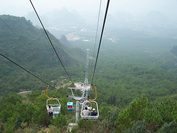 搭乘索道前往海拔九百公尺高的堯山頂一覽桂林風光