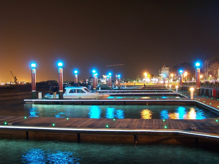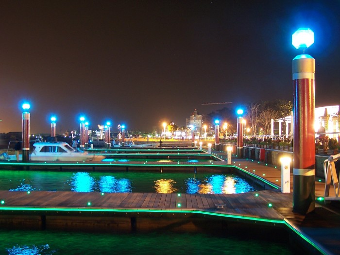哈馬星漁人碼頭夜色:碼頭霓虹燈會隨著時間而變色哦! 右手邊則為碼頭入口處...